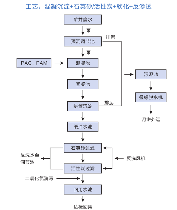 凈化處理技術主要有沉淀、混凝沉淀、混凝沉淀過濾(混凝澄清過濾)等,根據(jù)處理后不同的用途采用不同的工藝組合。