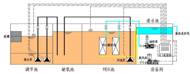 主要包括一下五大單元:(1)調節池、(2)缺氧池、(3)MBR池、(4)設備間、(5)清水池